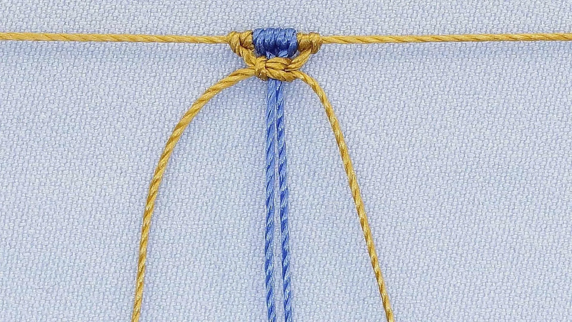 Pull both working threads to tighten the knot against the anchor threads. This completes the first half of the Square Knot.